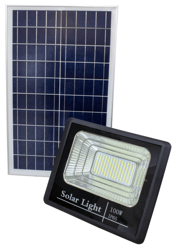 Projetor LED 100W com Bateria. Painel Fotovoltaico. Comando Remoto e Cabo 5m